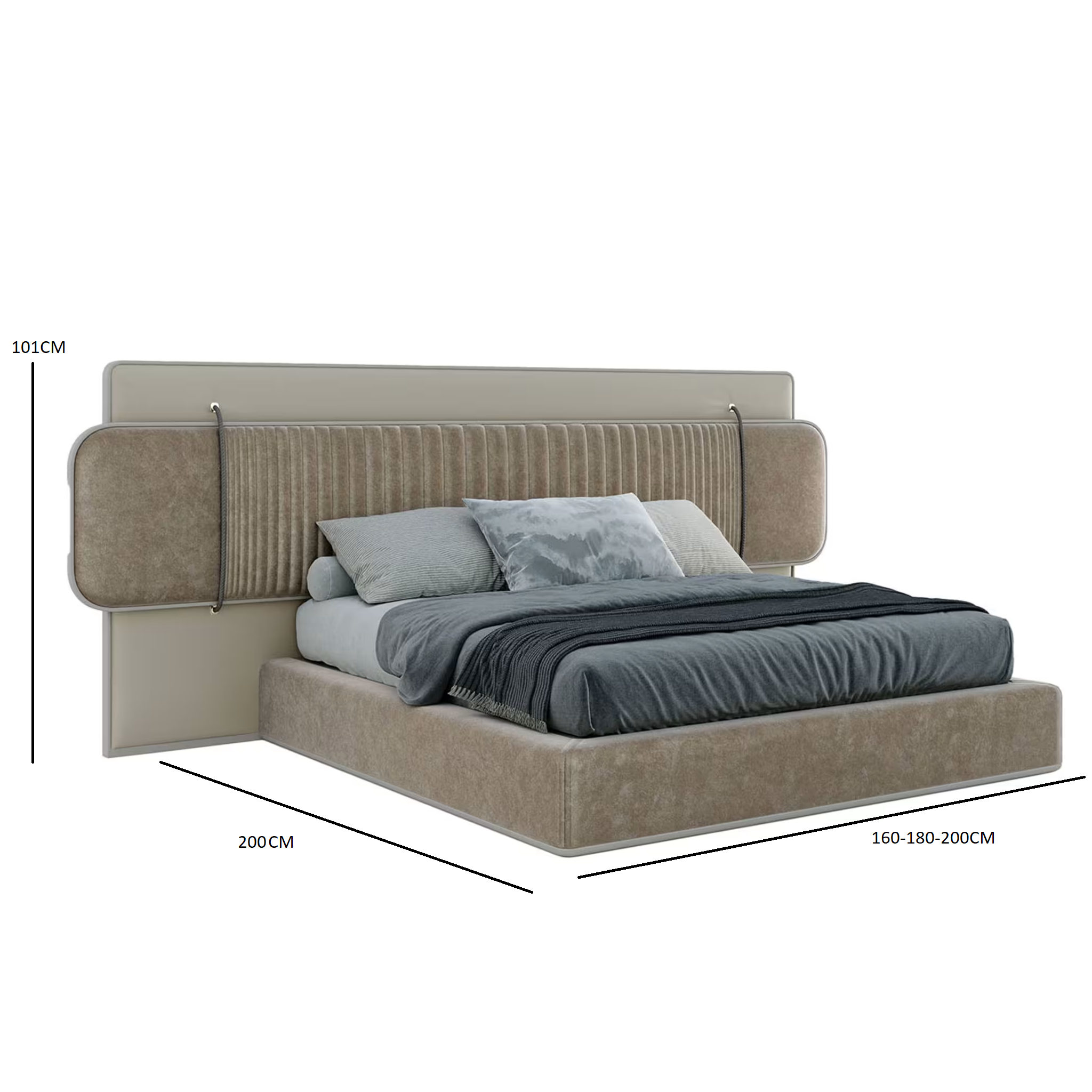 سرير بتصميم معاصر فاخر يجمع بين الراحة والأناقة، مصنوع من خشب طبيعي متين ومغطى بقماش ناعم مع تفاصيل من الجلد الفاخر. يتوفر باللون البيج الغامق الذي يضفي لمسة من الفخامة والرقي على غرفة النوم. يأتي بأبعاد متعددة لتناسب احتياجاتك (عرض 150، 160، 180، 200 سم، عمق 213 سم، ارتفاع 101 سم)، مما يجعله مثاليًا للغرف الواسعة.