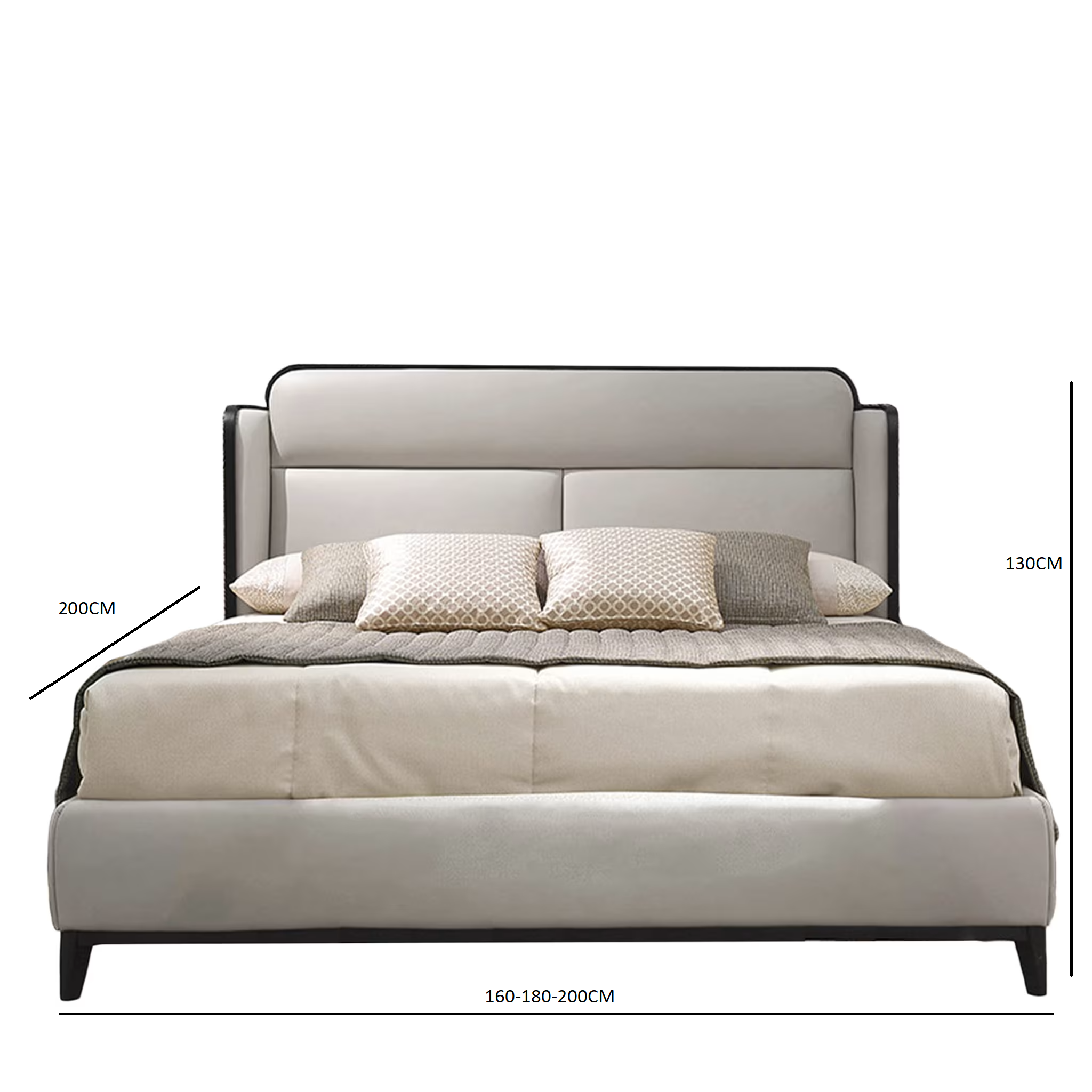 سرير عصري يجمع بين التصميم الأنيق والراحة المطلقة، مصنوع من جلد رمادي فاخر مع تفاصيل سوداء تضفي لمسة جمالية. يتميز بإطار خشبي طبيعي قوي يوفر دعماً مثالياً، مع خيارات عرض متعددة تناسب احتياجاتك. بفضل ارتفاعه المناسب، يضمن لك تجربة نوم مريحة مع إضافة لمسة عصرية لأي غرفة نوم.