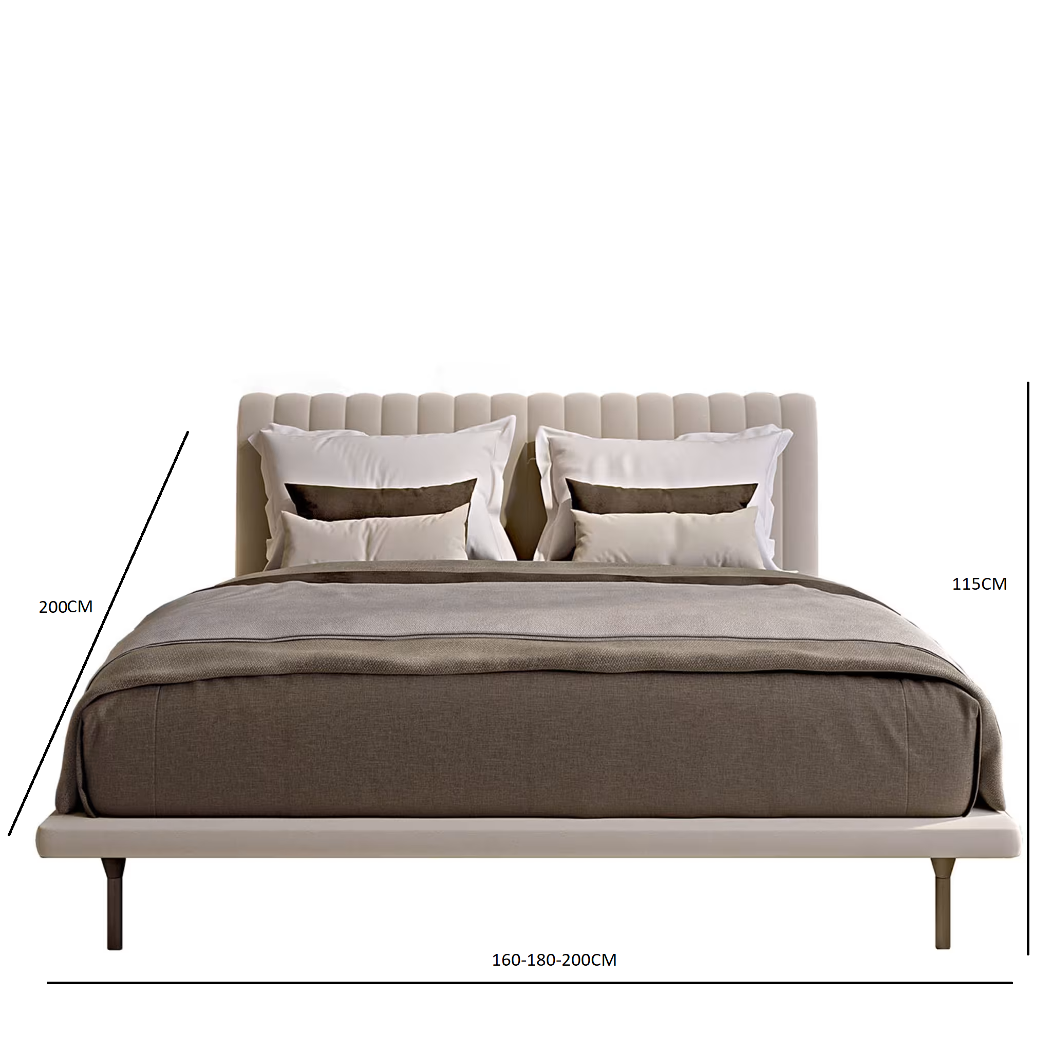 سرير أنيق بتصميم فاخر يجمع بين الخشب الطبيعي ومعدن المتين، مع تنجيد ناعم من القماش باللون البيج الفاتح والمزين بلمسات ذهبية. يأتي بمقاسات عرض متعددة (160-180-200 سم) وعمق 200 سم، مما يجعله مثاليًا لغرف النوم الواسعة. يتميز بارتفاع 115 سم، مما يمنحه مظهرًا فاخرًا وفخمًا. تصميمه العصري يضيف لمسة من الأناقة والرقي إلى أي غرفة نوم، ويعزز من الإحساس بالراحة والفخامة.