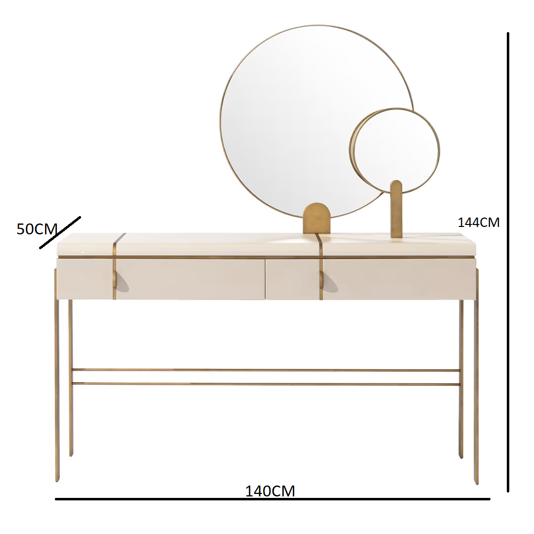 تسريحة بتصميم مودرن تجمع بين الأناقة والوظيفة. تأتي بأبعاد مثالية (140 سم عرض × 50 سم عمق × 144 سم ارتفاع) لتوفير مساحة واسعة للتخزين. مصنوعة من خشب طبيعي عالي الجودة مع تفاصيل معدنية من ، تضفي لمسة عصرية وفاخرة. تتميز بلون أبيض مع لمسات ذهبية، مما يجعلها خيارًا مثاليًا لأي غرفة نوم تضفي لمسة من الفخامة.