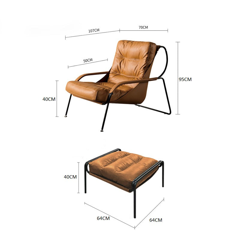 كرسي بذراعين مصنوع من الجلد والمعدن، يجمع بين الفخامة والراحة في تصميم عصري أنيق. يتميز بلون بني أو أسود، مما يضفي لمسة راقية تناسب مختلف الأذواق والديكورات. مصنوع من جلد عالي الجودة ومعدن متين يضمن الثبات والمتانة. الكرسي بأبعاد مثالية (عرض 70 سم، عمق 107 سم، ارتفاع 95 سم) مع مسند قدمين منفصل يوفر راحة إضافية بأبعاد (عرض 64 سم، عمق 64 سم، ارتفاع 40 سم)، ليكون الخيار الأمثل للاسترخاء والراحة بأسلوب عصري.
