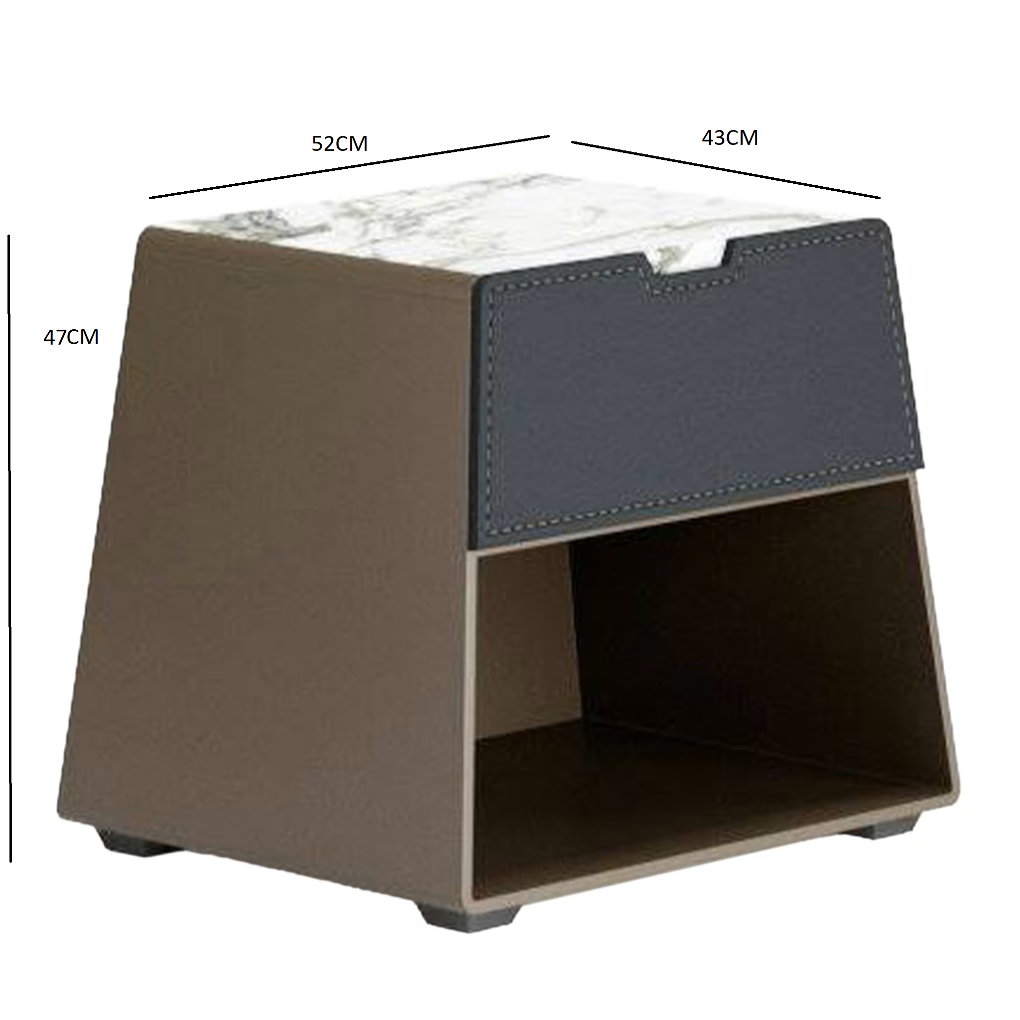 طاولة بجانب السرير فريدة تجمع بين الأناقة والوظائف العملية. بأبعاد مثالية (العرض 52 سم × العمق 43 سم × الارتفاع 47.5 سم)، توفر هذه الطاولة مساحة كافية لتخزين الأغراض الشخصية أو وضع المصابيح. مصنوعة من مزيج رائع من المواد، بما في ذلك الرخام، الخشب الطبيعي، والجلد، مما يضمن المتانة والرفاهية. تأتي بتصميم أنيق يجمع بين الأبيض مع البني والأسود، مما يضيف لمسة عصرية لأي غرفة نوم،