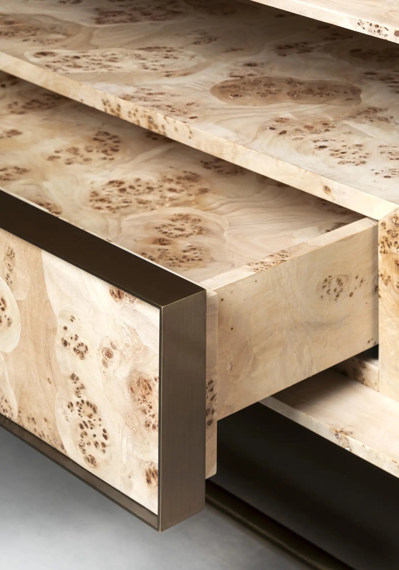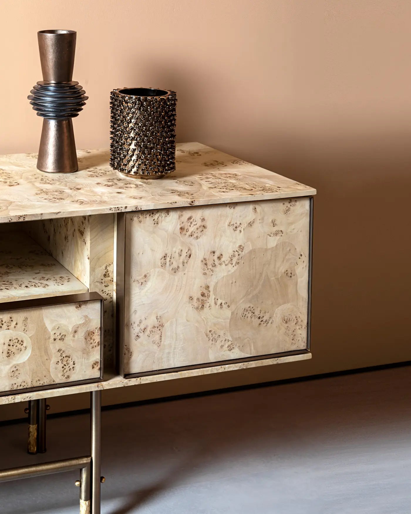 Details: Dimensions: Height 80 × Depth 52 × Width 190 cm Materials: Natural wood – Metal Color: Beige with Bronze