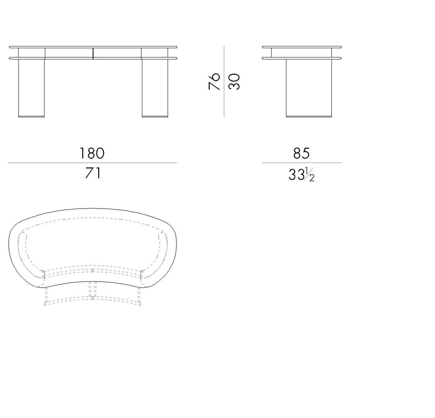 A modern writing desk with soft rounded edges and fluid curves, combining elegance and functionality. Features two drawers and silver metal accents for a refined look.