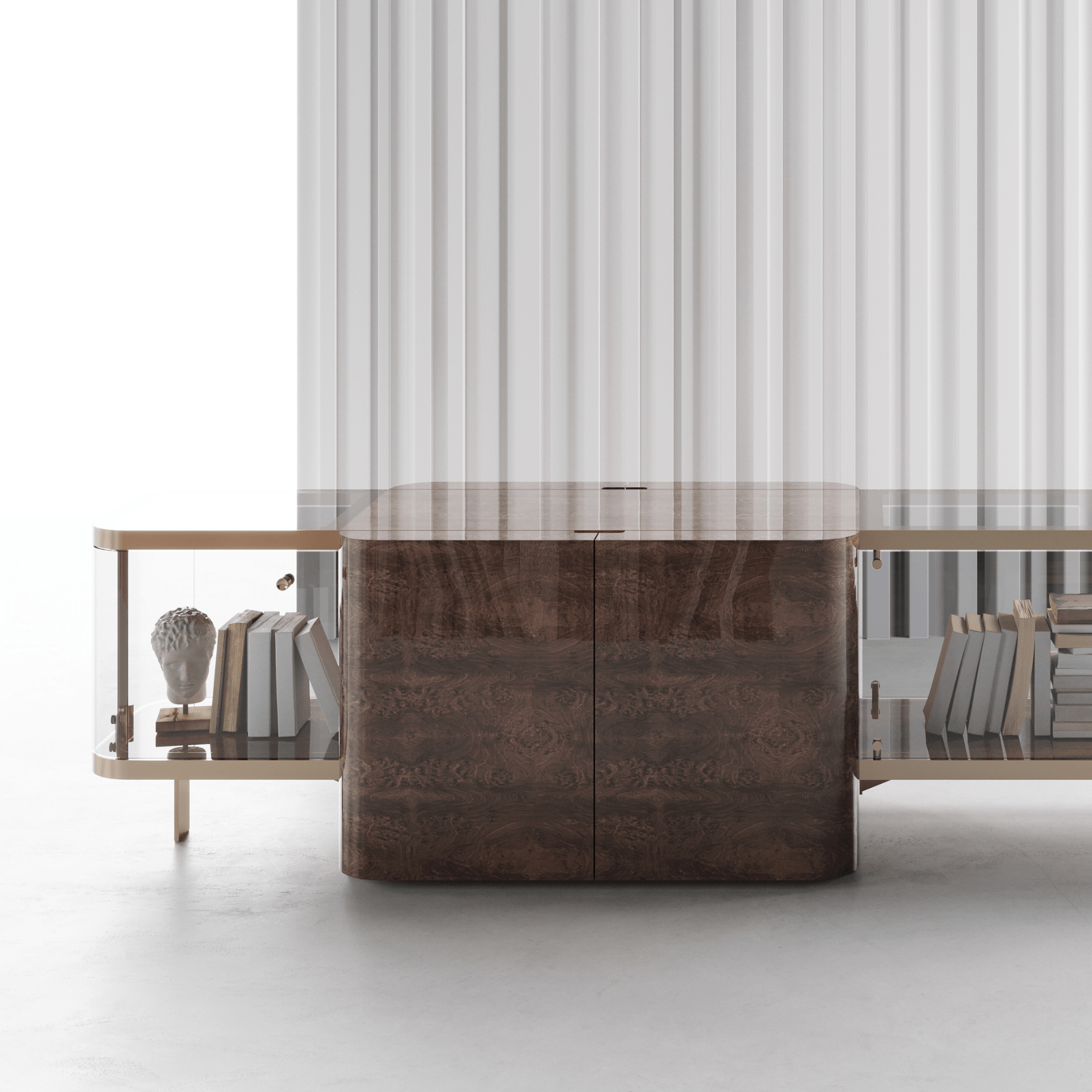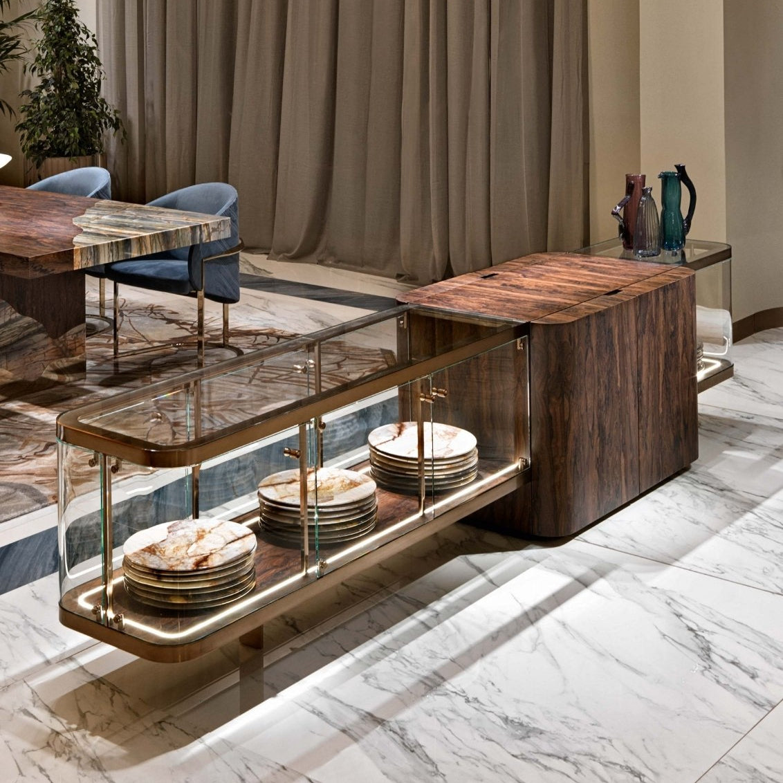 The Lisa Buffet showcases a perfect blend of luxury and modern design. With its impressive width of 320 cm, depth of 69 cm, and height of 70 cm, it offers generous storage and display space, making it an elegant centerpiece in any dining or living area. Crafted from high-quality natural wood, accented with stainless steel and glass details, it ensures both durability and a refined aesthetic. The rich brown finish combined with matte gold accents adds a touch of sophistication and timeless beauty to any contemporary interior.