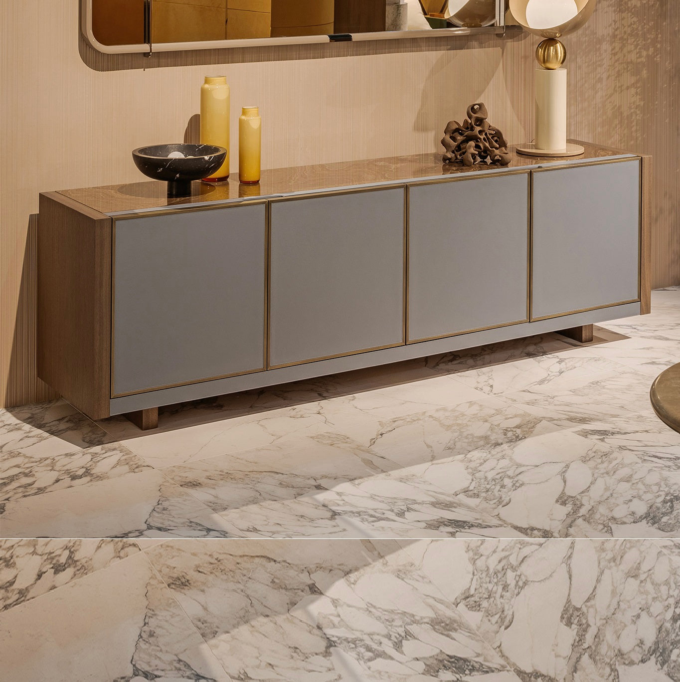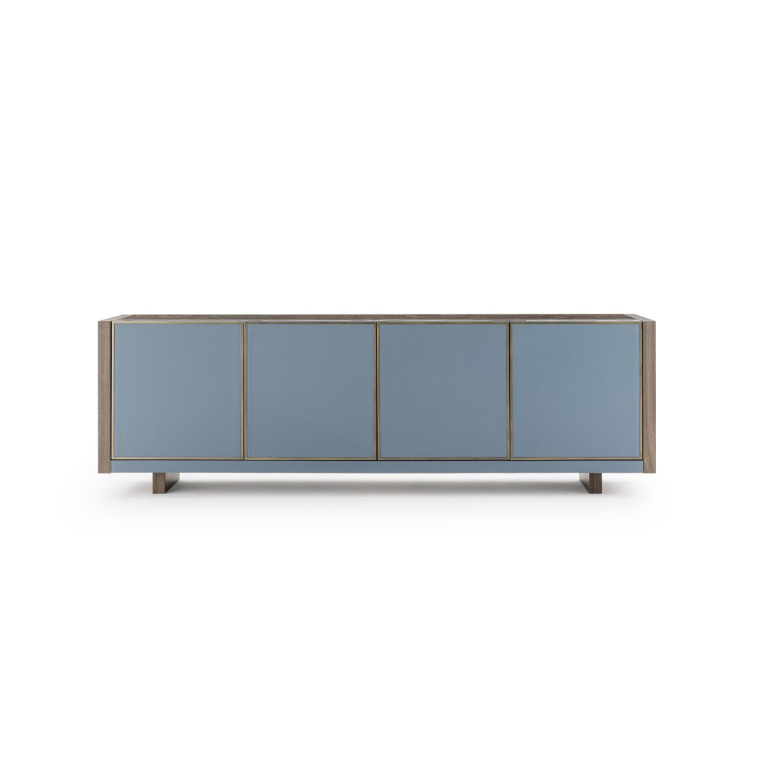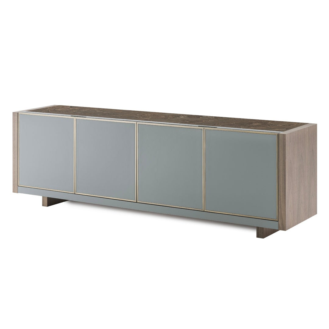 The Modern Dining Buffet Design combines functionality with contemporary elegance. Crafted from natural wood and accented with leather, it provides ample storage while adding a refined touch to any dining area. Its brown and dark gray finish enhances modern interiors with warmth and sophistication.