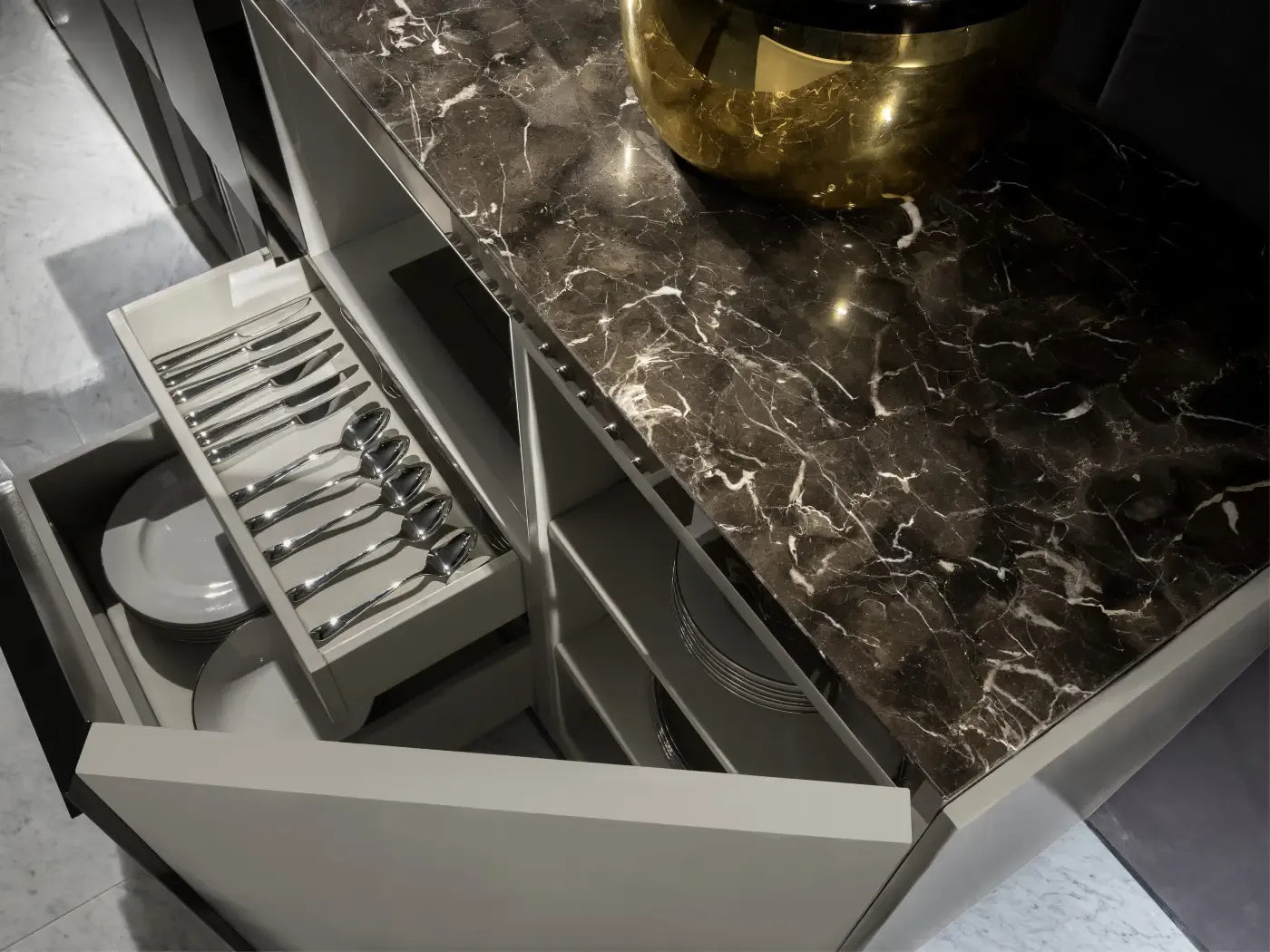 A contemporary sideboard featuring a cream lacquered body and elegant brown marble top. Its refined composition offers both aesthetic balance and smart storage for tableware and cutlery.