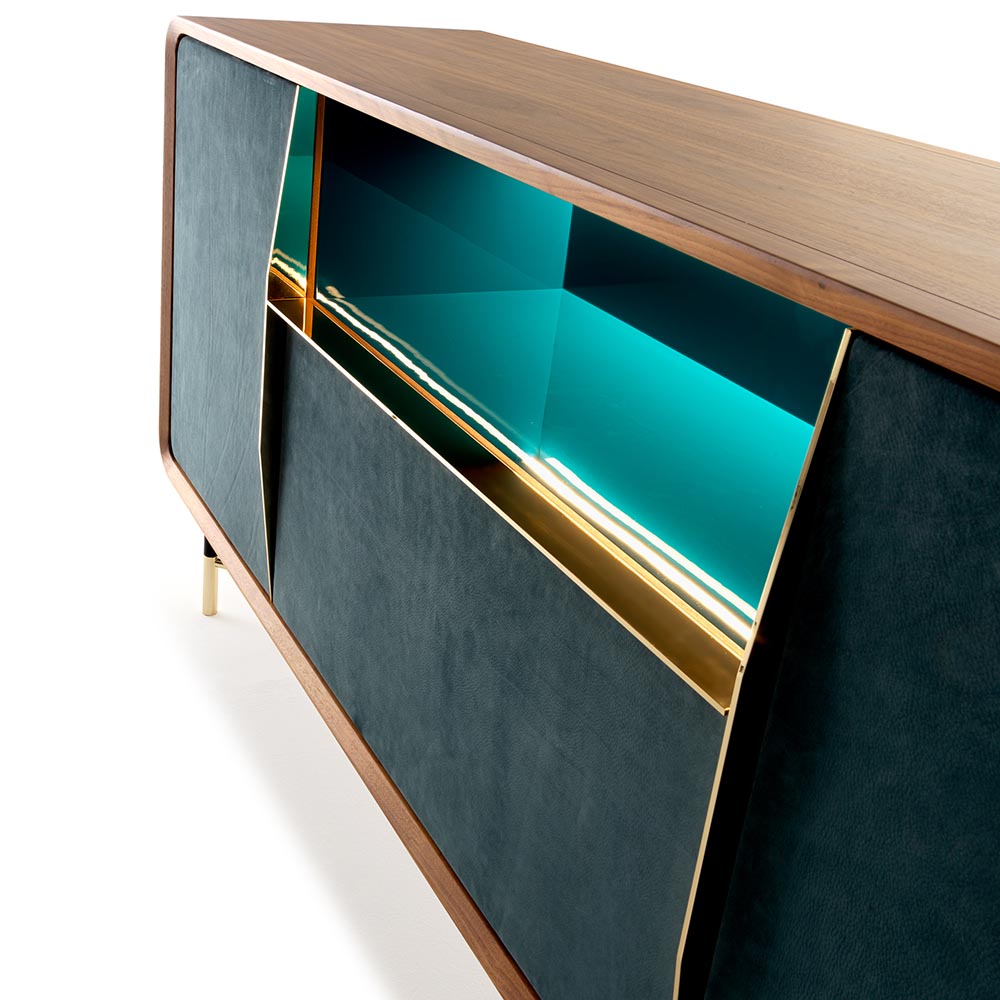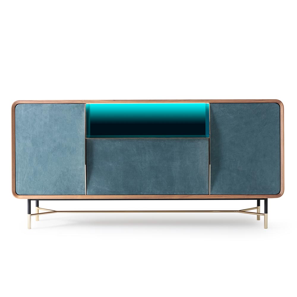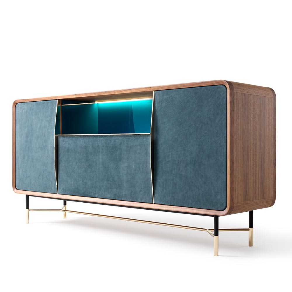 The Sereno Buffet embodies modern luxury through its refined mix of materials and bold design. Crafted from natural wood and leather, with sleek metal accents, it offers both elegance and durability. The combination of brown, black, and blue tones creates a sophisticated and contemporary aesthetic, making it a standout piece in any dining or living space.