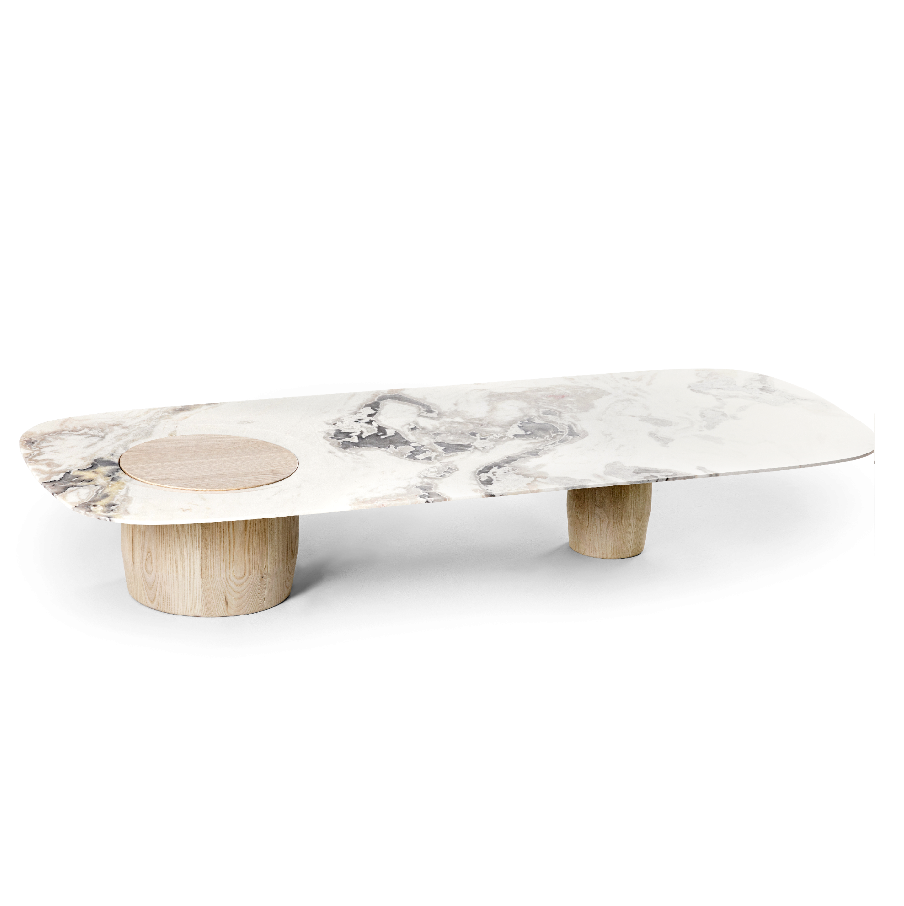 The Elegant Coffee Table combines natural warmth with modern sophistication, creating a refined centerpiece for any living space. Crafted from natural wood with a Marble Substitute for durability and luxury. Its spacious rectangular design offers both functionality and timeless appeal. The wood and white color combination adds a clean, elegant touch to contemporary interiors.