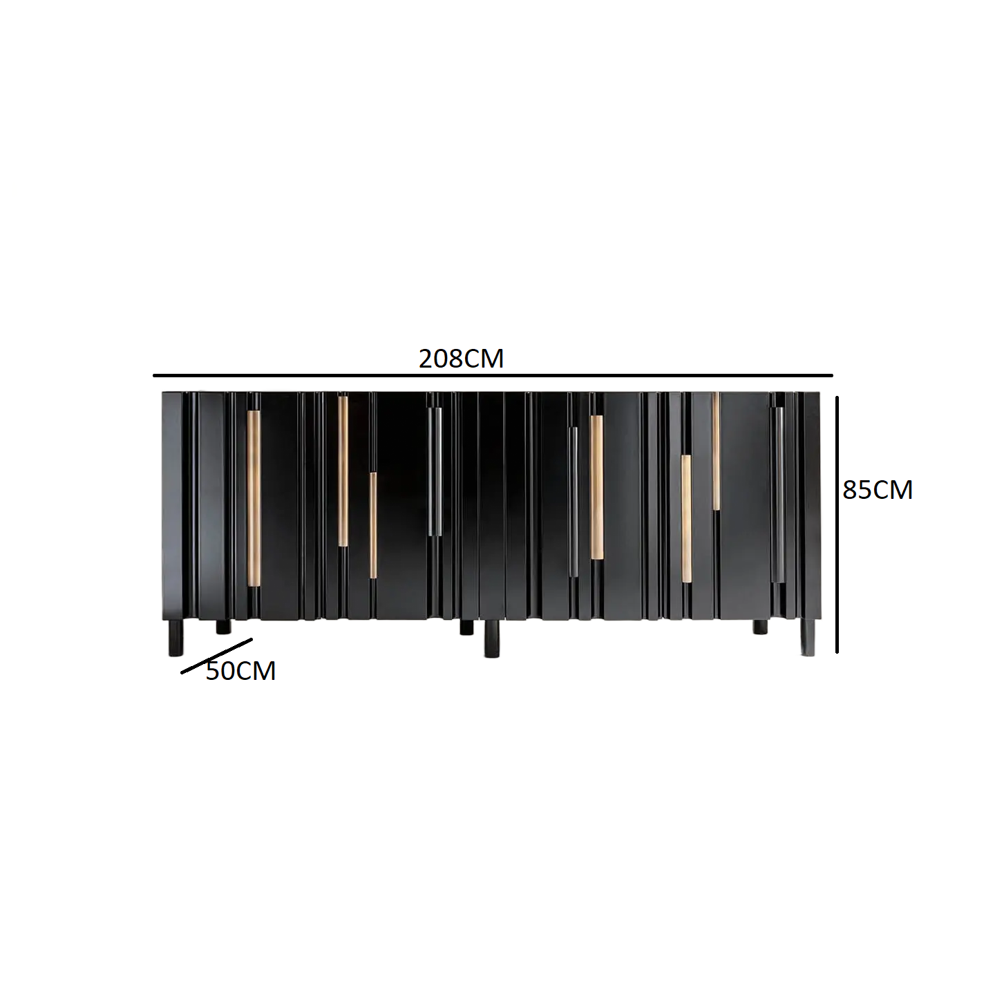 Description: This European-style buffet showcases a perfect blend of luxury and timeless design. With its elegant black finish enhanced by refined golden accents, it adds a sophisticated touch to any dining or living space. Measuring 208 cm in width, 50 cm in depth, and 85 cm in height, it offers ample storage space while maintaining a sleek and modern appearance. Crafted from high-quality natural wood, this buffet ensures durability, elegance, and lasting beauty — a statement piece for any refined interior.