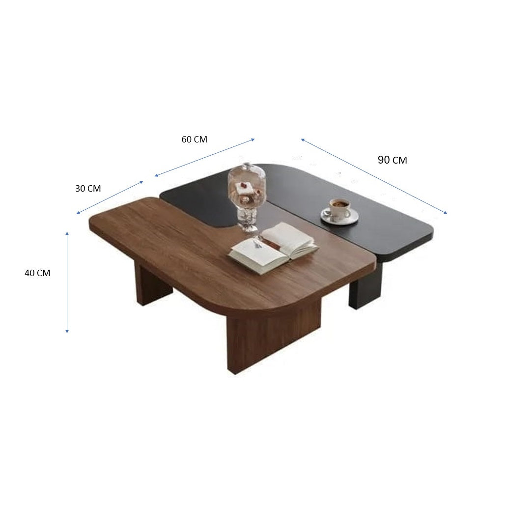 Description: Elegant and modern, this dual-tone puzzle coffee table set features two interlocking pieces crafted from high-quality natural wood. The combination of dark wood, wooden black, and warm brown tones creates a sophisticated contrast that enhances any living space. With dimensions of 90 cm in width, 90 cm in depth, and 40 cm in height, it serves as a functional and stylish centerpiece, perfectly blending contemporary design with timeless charm.